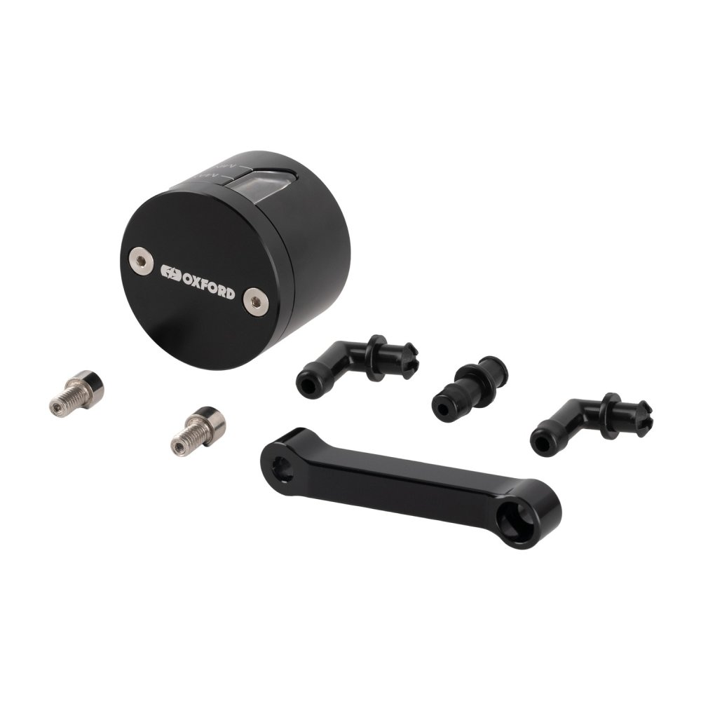 Univerzální baňka přední brzdy navržena pro závodní účely a sportovní motocykly. Plášť ze slitiny hliníku obráběného pomocí CNC, eloxovaný černý povrch, doplněný o jasně čitelné průzory pro stav hladiny brzdové kapaliny z obou stran baňky. Expanzní těsnění víčka baňky poskytuje prostor pro brzdovou kapalinu v případě, že se přehřeje a roztahuje uvnitř brzdového systému.