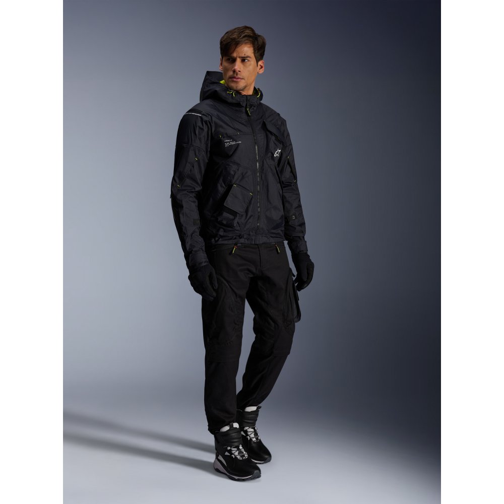 - Lehká, nastavitelná a skladná kapuce posytuje ochranu před nečekaným deštěm, zatímco patent pro její fixaci zabraňuje jejímu pohybu během jízdy na motocyklu. Kapuci lze sbalit a skrýt do zakladače v límci.