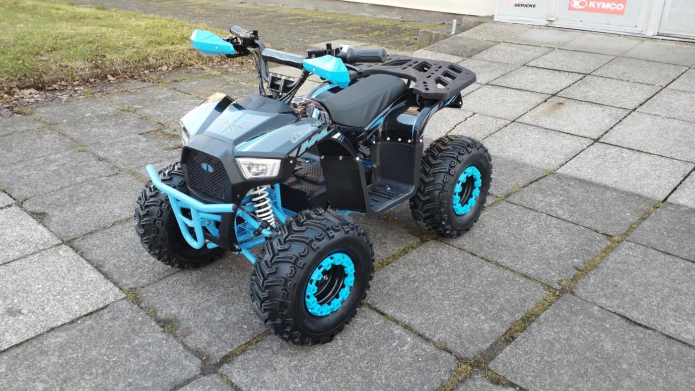 Tato čtyřkolka má třístupňový omezovač rychlosti. Má velký rejd, funkční tlumiče, hydraulické brzdy - i malé dítě bez problémů dosáhne a má fyzicky na to, aby páčku stisklo tak, že stroj zabrdzí! Obrovská výhoda vůči levným/lankovým brzdám. Stroj nemá pojistný nožní pedál - po zapnutí klíčku stačí prostě otočit plynem! Pokud chce pilot couvat, tak stiskne tlačítko "R" a stroj poté pojede dozadu. Dítě se nemusí starat o několik věcí současně...za nás dobře řešená a zpracovaná čtyřkolka pro děti od čtyř let za normální peníze! Nekupujte dětem starším 8-mi let a zohledňujte výšku jejich postavy...ať to je investice na nějaký čas (děti pořád rostou). Obrovskou výhodou je motor umístěný přímo na nápravě = žádný řetěz! Primitivní diferenciál = stroj se krásně ovládá!