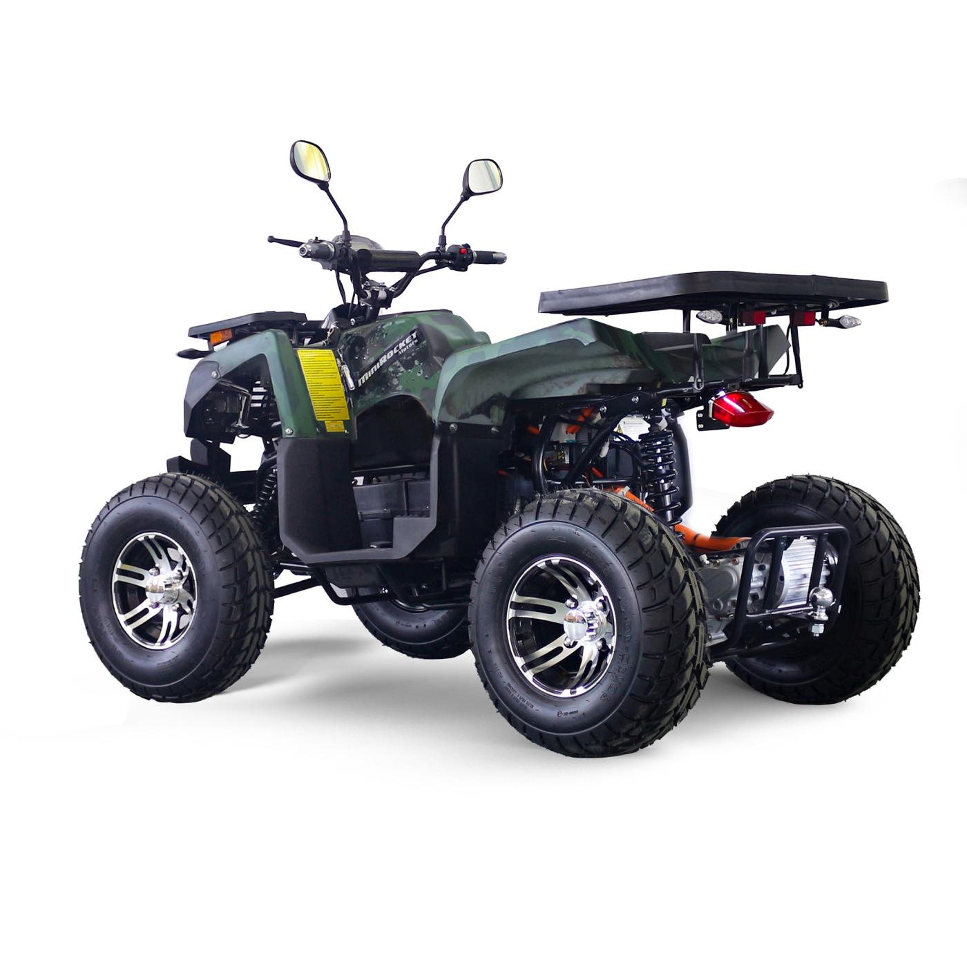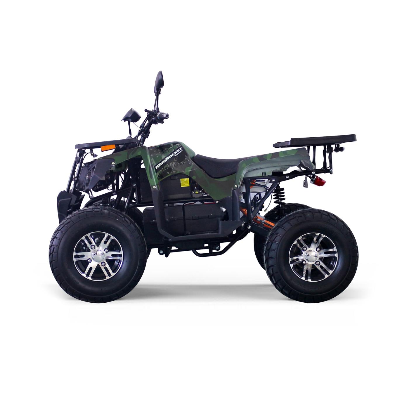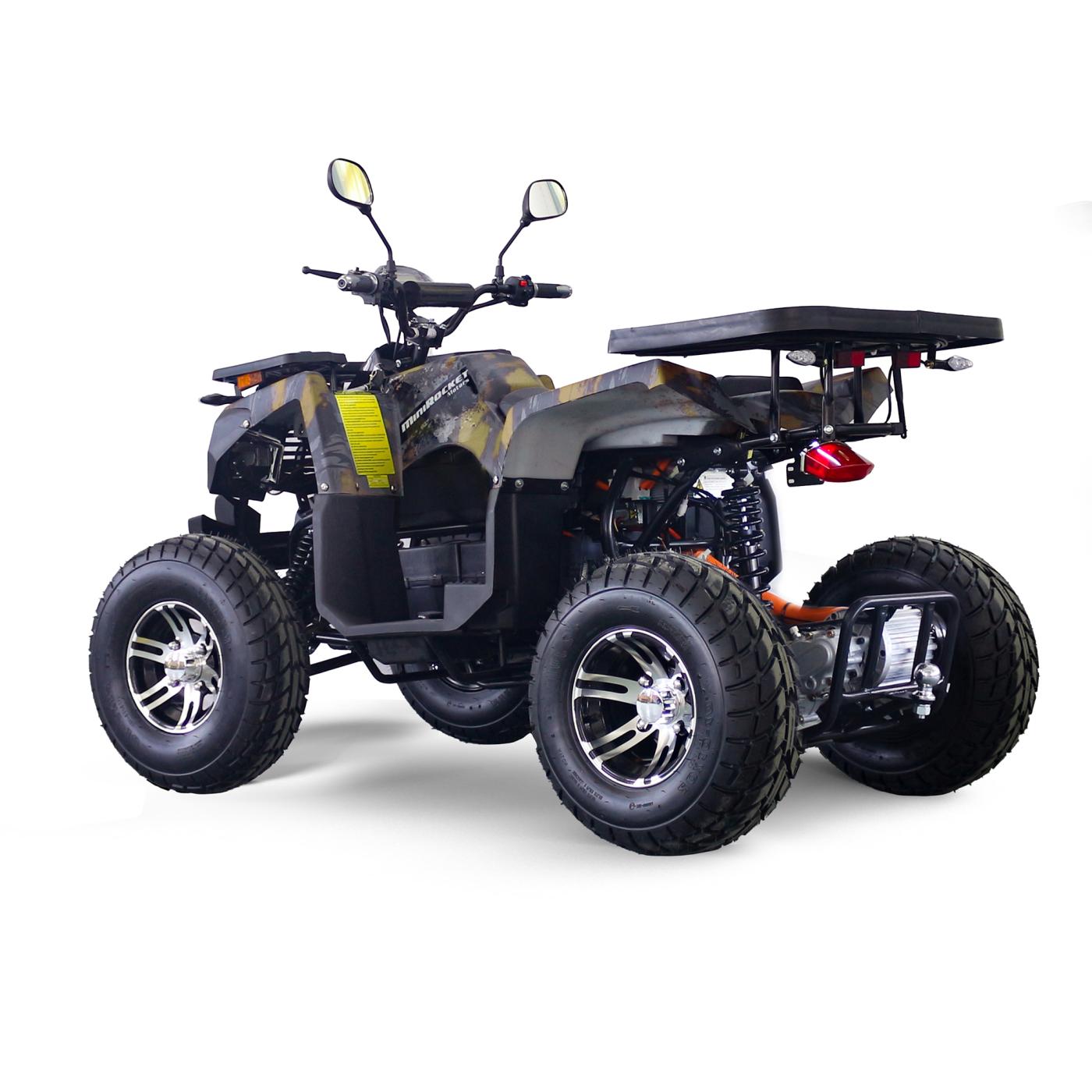 Čtyřkolka je vybavena předními bubnovými brzdy a zadními kapalinovými, kotoučovými brzdami. Přední bubnové brzdy jsou ovládány pákou na řídítku, zadní kotoučové kapalinové brzdy jsou ovládány pedálem, pravou nohou. Motor je osazen na zadní odpružené nápravě, převod z motoru na osu je pomocí uzavřené převodové skříně. Přední kola jsou na samostatně odpružených závěsných ramenech. Na propracovaných hliníkových ráfcích jsou osazeny velké pneumatiky s terénním dezénem zajišťujícím dokonalou trakci v terénu. Na řídítkách je upevněn digitální tachometr. Dravým vzhledem i akcelerací se stroj přibližuje „dospělým“ čtyřkolkám se spalovacím motorem. Zásadní výhodou je však naprosto tichý provoz bez emisí. Provozovat tedy lze i v místech, kde by hluk nebo zápach zplodin mohl okolí obtěžovat.