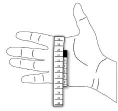 Vezměte svinovací metr a změřte obvod dlaně. Měření proveďte podle obrázku v galerii. Podle naměřené hodnoty si vyberte z tabulky správnou velikost.