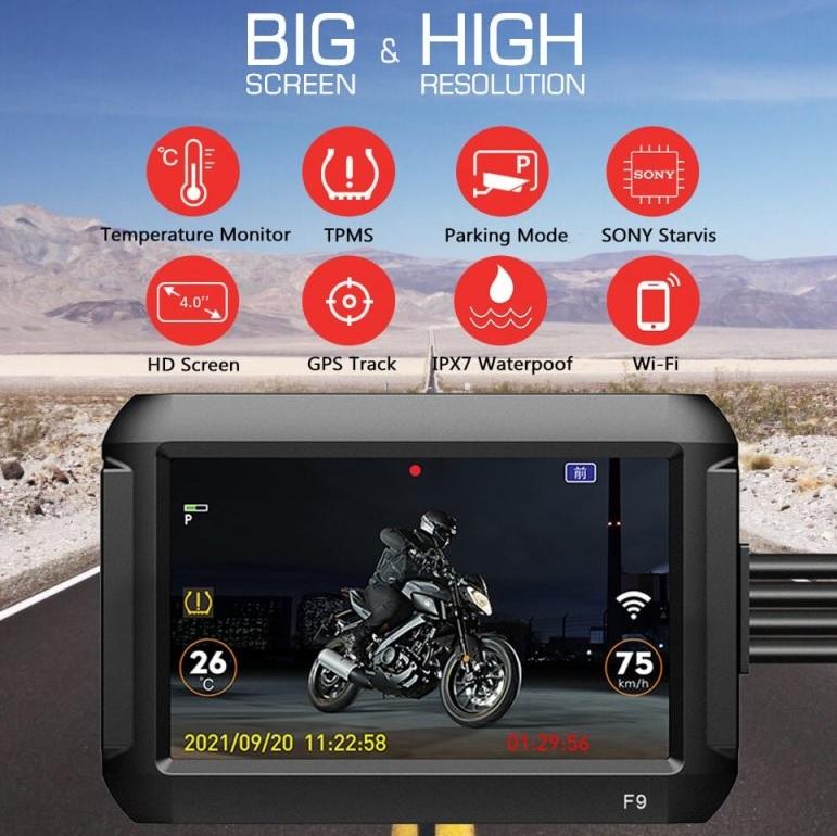 Duální kamera na motorku, která nahrává zároveň situaci před i a za vozidlem. Integrovaná Wi-Fi umožňuje propojit kameru se smartphonem. 4x TPMS ventilky pro možnost sledování tlaku v pneumatikách.