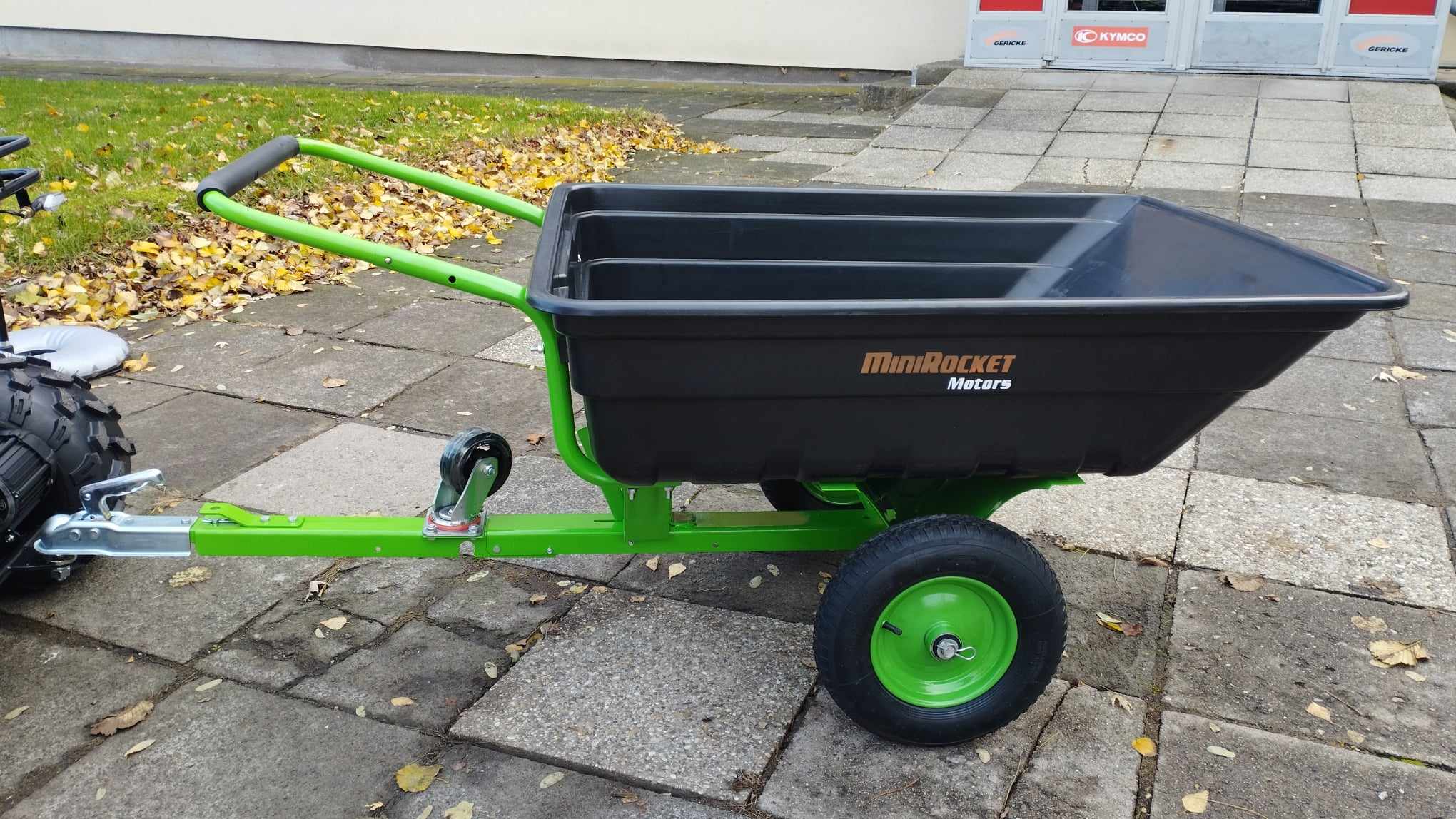 Na fotkách s vozíkem je velikostně totožná čtyřkolka, jde o vozík Gardener, který nalezenete také v naší nabídce.