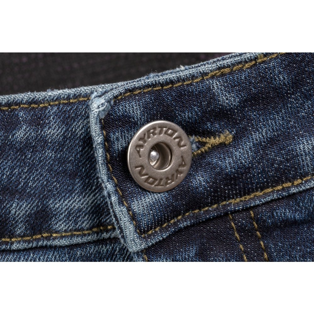 Druhá generace jeansových kalhot AYRTON 505 přichází s vylepšením v podobě nových CE certifikovaných protektorů LITE PRO, které jsou pružné, lehké, prodyšné a díky malé tloušťce i nenápadné. Díky vnější vrstvě ze 100% 12-ti uncového streč denimu Super Stretch jsou kalhoty komfortní. Rozšíření nabídky nadměrných velikostí pokrývá i extra nadměrné velikosti. Krátký zip YKK® #8 umožňuje propojení kalhot s bundou. Uvedené detaily dodávají těmto všestranným kalhotám ještě širší možnosti použití oproti minulé generaci. Sepraná tmavě modrá povrchová úprava denim obšívky se světlejším stařeným povrchem.