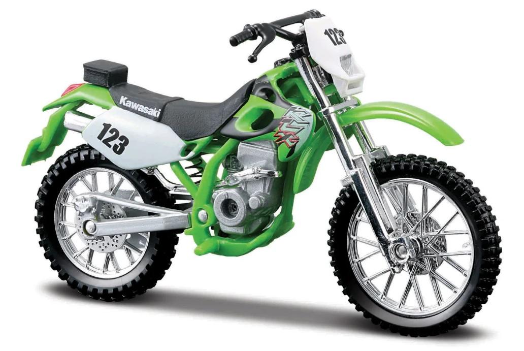 Kovové modely motocyklů v modelovém měřítku 1:18. Motocykly mají otáčivá řidítka a odpruženou zadní nápravu. Jsou usazeny na černém plastovém podstavci.