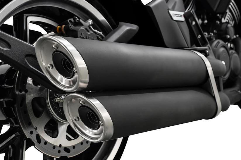 Vyladěný výfukový systém vydává hluboký, rezonující zvuk, který umocňuje zážitek z jízdy a odráží výkon motocyklu.