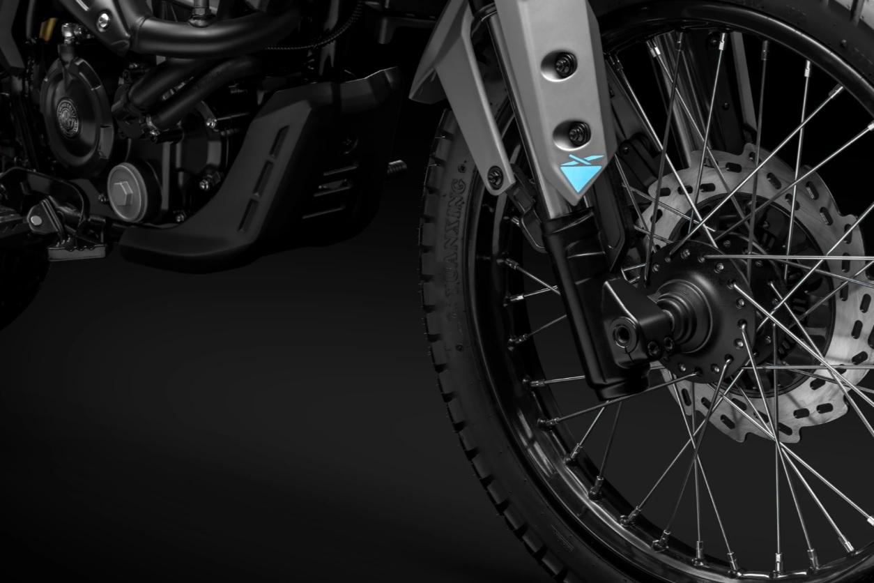 Přední 265mm a zadní 220mm ventilované kotouče, dvoupístkové třmeny a standardní ABS zajišťují bezpečné brzdění kol (19" vpředu / 17" vzadu) s pneumatikami (90/90-19 a 110/90-17) zajišťují přilnavost, trakci a odolnost ve smíšeném terénu.