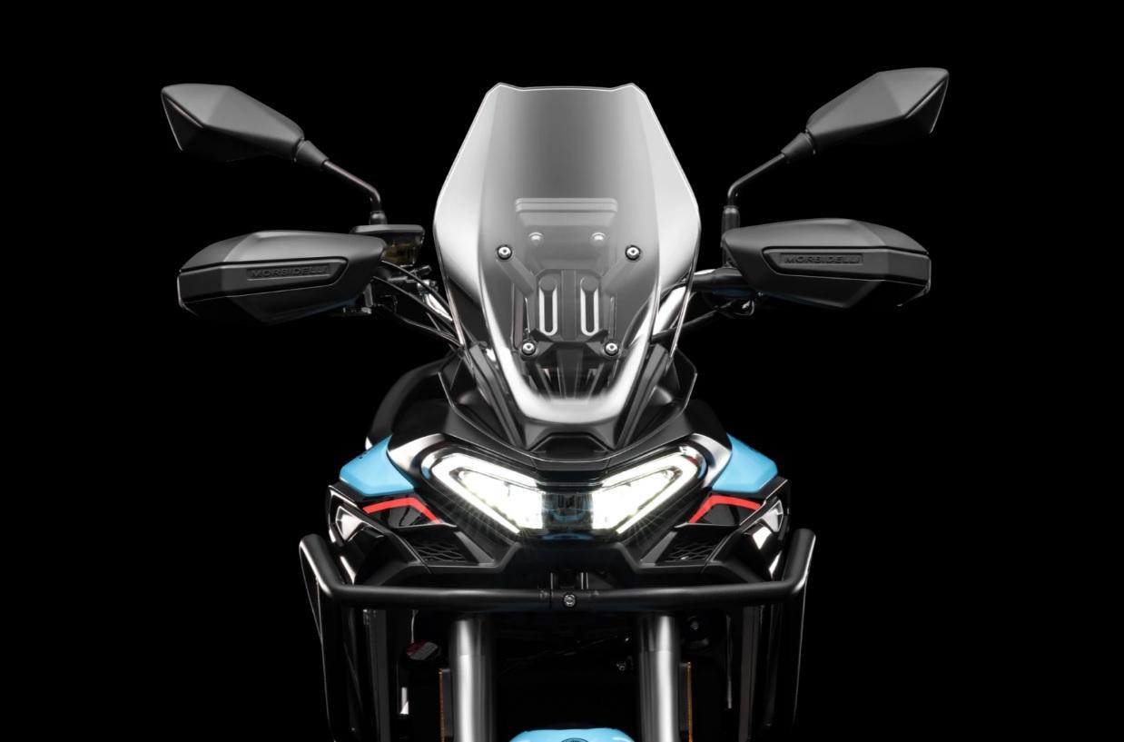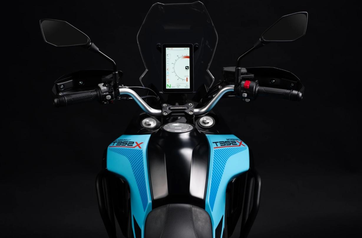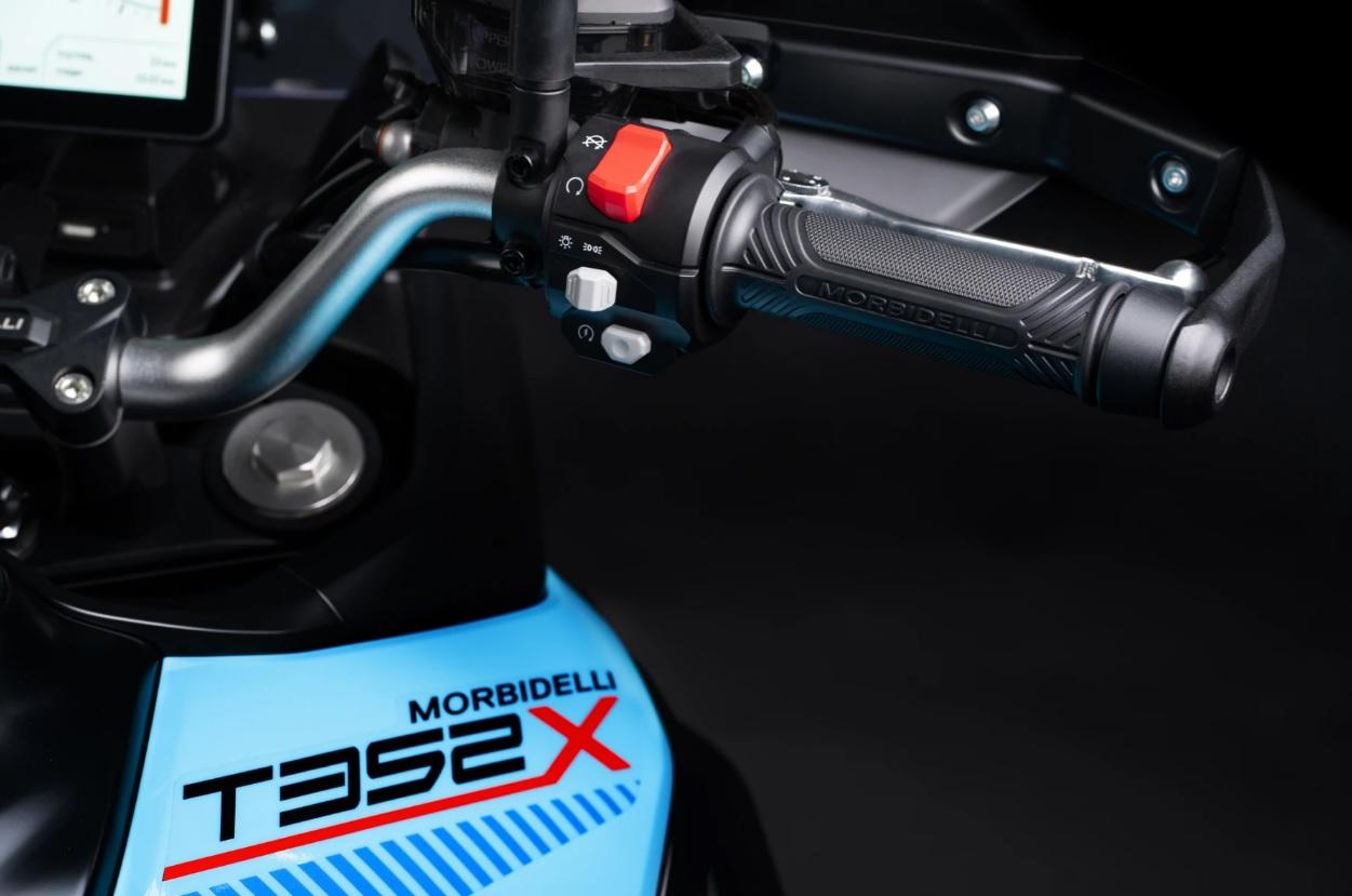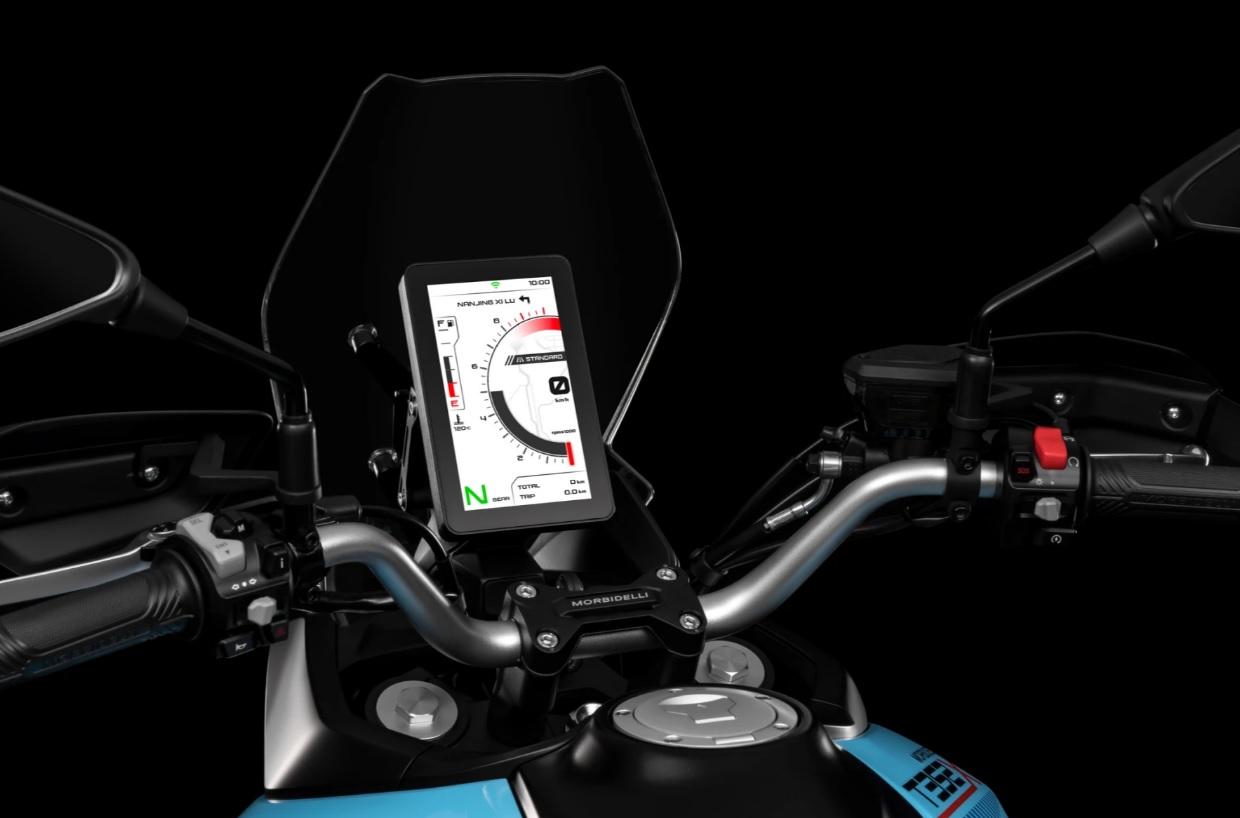 Vertikální obrazovka ve stylu rallye se 3 jízdními režimy (Standard, Sport a Off-road). Plná integrace systému Morbidelli Connect: GPS navigace, SOS tlačítko, ochrana proti krádeži s dálkovým vypnutím a roční přístup k aplikacím v ceně.