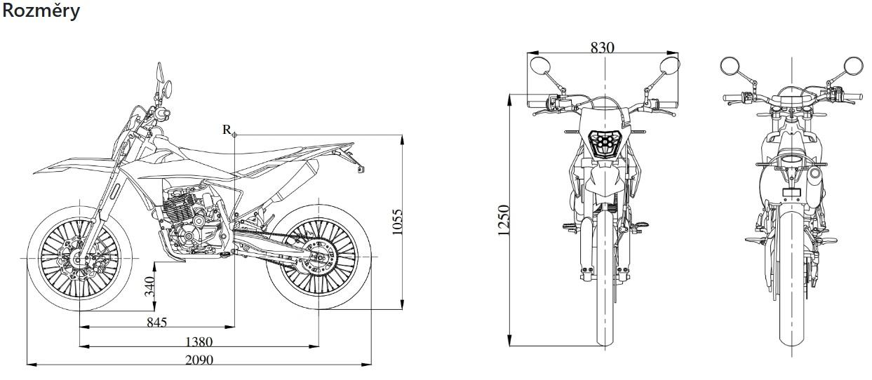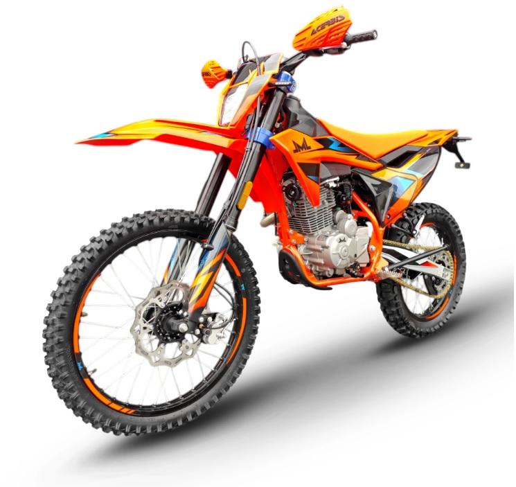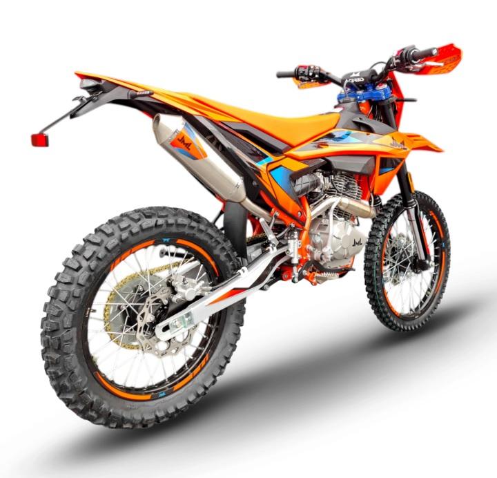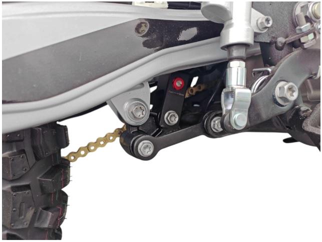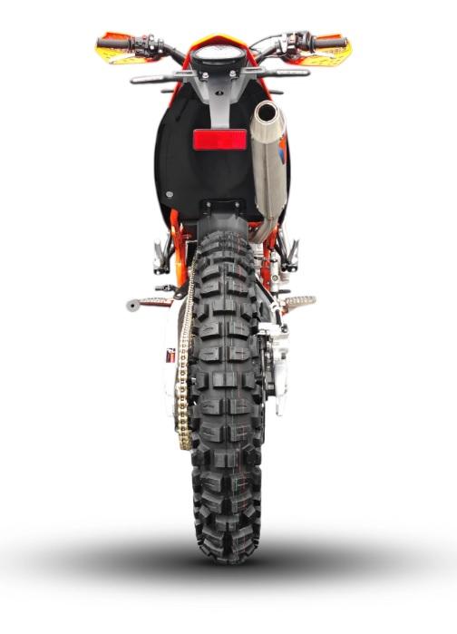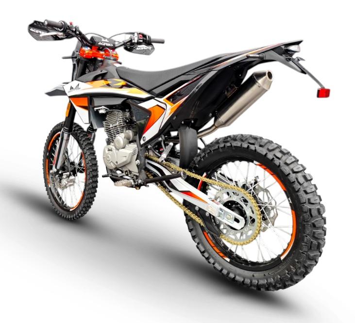 Rám je potažen kataforézním antikorozním nátěrem, který poskytuje vynikající ochranu proti korozi i na těžko dostupných místech. Celý rám je povrchově upraven odolným dvouvrstvým lakem, který zajišťuje vynikající vzhled a dlouhou životnost – řešení, které se obvykle nachází u motocyklů vyšší třídy. Nastavitelné 41mm přední tlumiče umožňují nastavení odskoku a komprese, což zajišťuje přesné vyladění podle vašeho stylu jízdy a terénu. Zadní odpružení o délce 385 mm je nastavitelné, což umožňuje přizpůsobit jeho funkci individuálním preferencím a terénním podmínkám. Motocykl je vybaven ocelovým systémem zadního zavěšení(přepákování), který zlepšuje jeho ovládání a zvyšuje jízdní komfort v náročném terénu, stejně tak lehké a odolné ráfky z hliníkové slitiny řady 6, což je materiál používaný u motocyklů vyšší třídy pro jejich vynikající odolnost vůči deformaci a nárazům. Náboje kol jsou také vyrobeny z lehkého hliníku, což dále snižuje neodpruženou hmotu a zlepšuje ovladatelnost. Motocykl je vybaven zesílenými ocelovými opletenými brzdovými hadicemi – vpředu i vzadu – které zajišťují přesné rozložení brzdné síly, vysokou odolnost a spolehlivost v extrémních podmínkách.