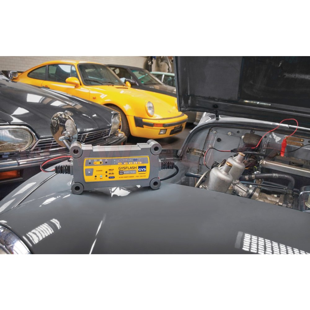 GYSFLASH HERITAGE 6A je vhodná pro moderní automobily i motocykly. 8-kroková inteligentní nabíjecí křívka zaručuje optimální nabíjení všech typů baterií. Speciální režim umožňuje nabíjení 6/12 V baterií s nízkou kapacitou od 1.2 Ah. Nabíječka je tedy vhodná i pro motocyklová a automobilové veterány.
