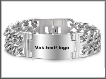 Náramek s laserově zhotoveným nápisem/logem dle Vašeho přání, materiál chir. ocel – lesklé provedení. Barva laserového nápisu černá, neodírá se. Délka náramku 19cm, 21cm, 23cm nebo 24,5cm (očka lze rozevřít a ubrat), šířka náramku 2,2cm. Velikost destičky 3,5cm x 2,3cm.