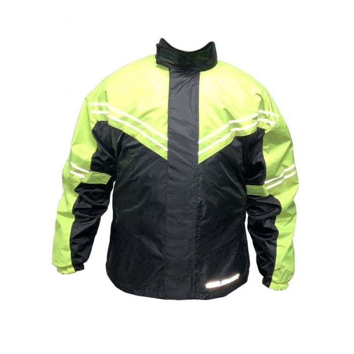 100% vodotěsná převleková bunda s reflexními prvky a pruhy, kombinace Nylonu a PVC, vnitřní kapsa, stahování v pase, rukávy na suché zipy, nepromokavé zipy.