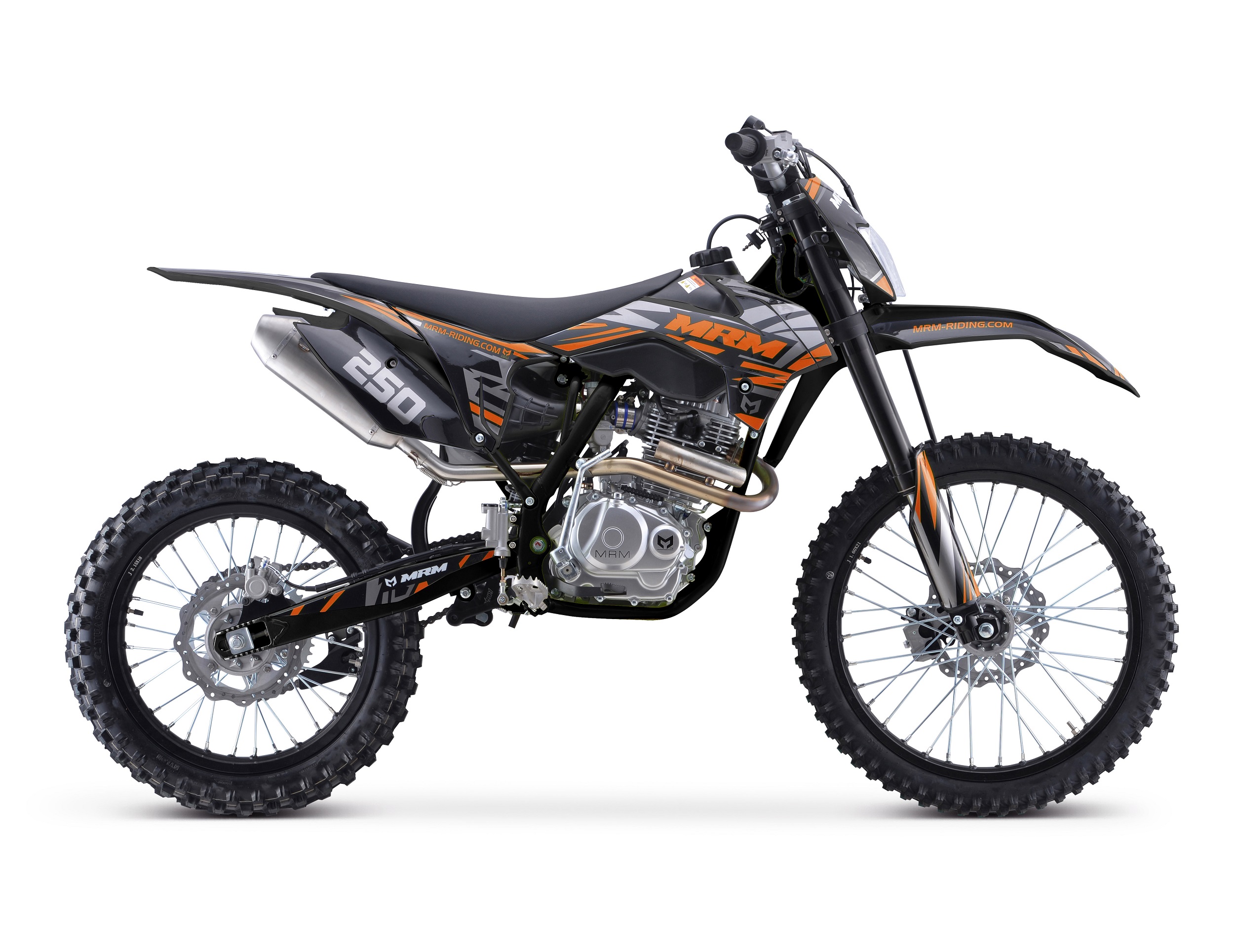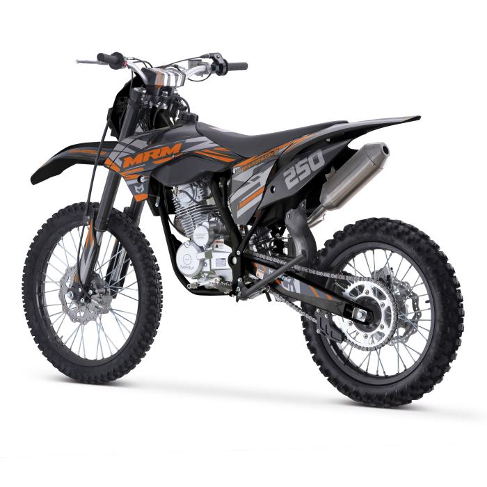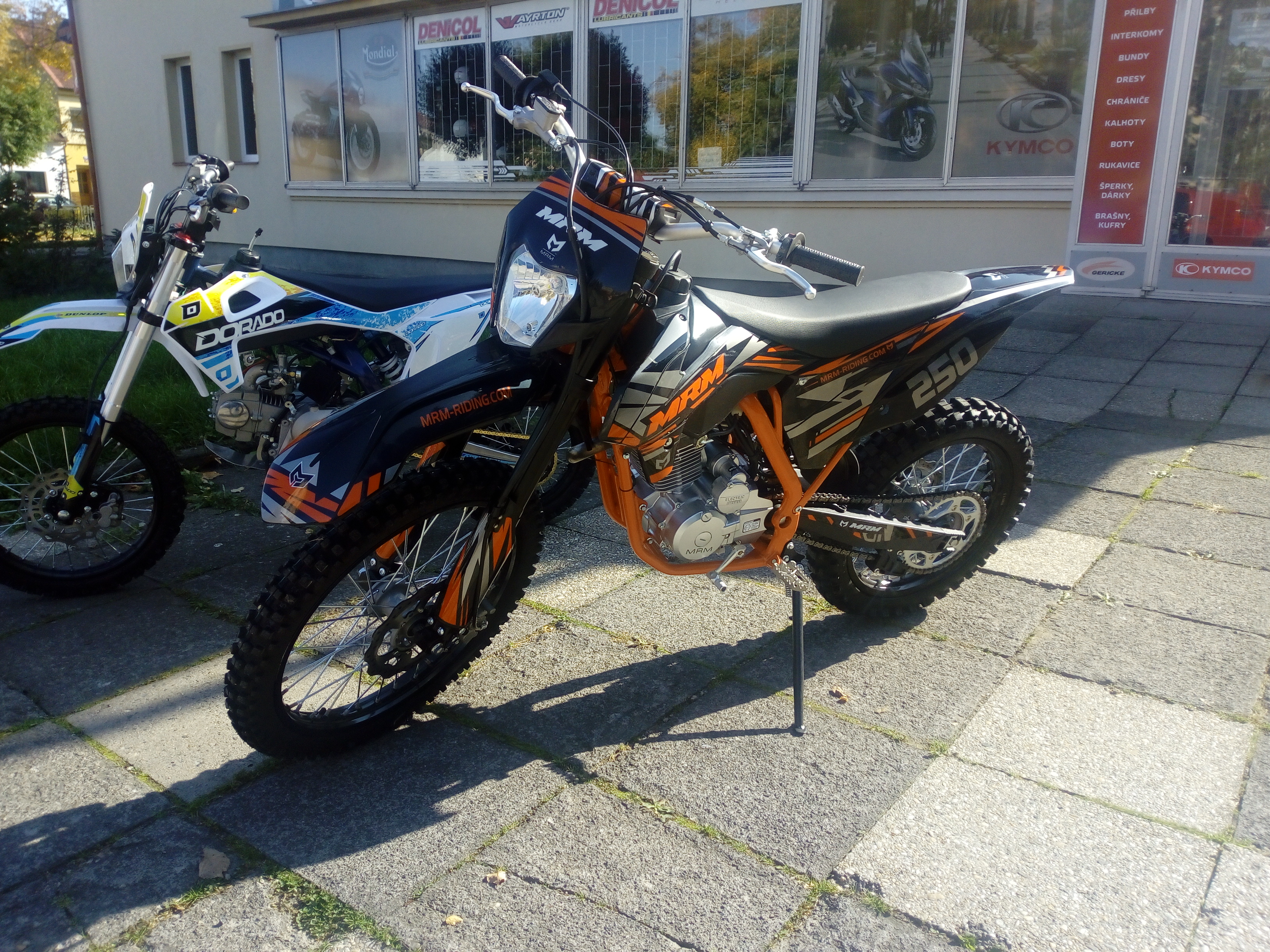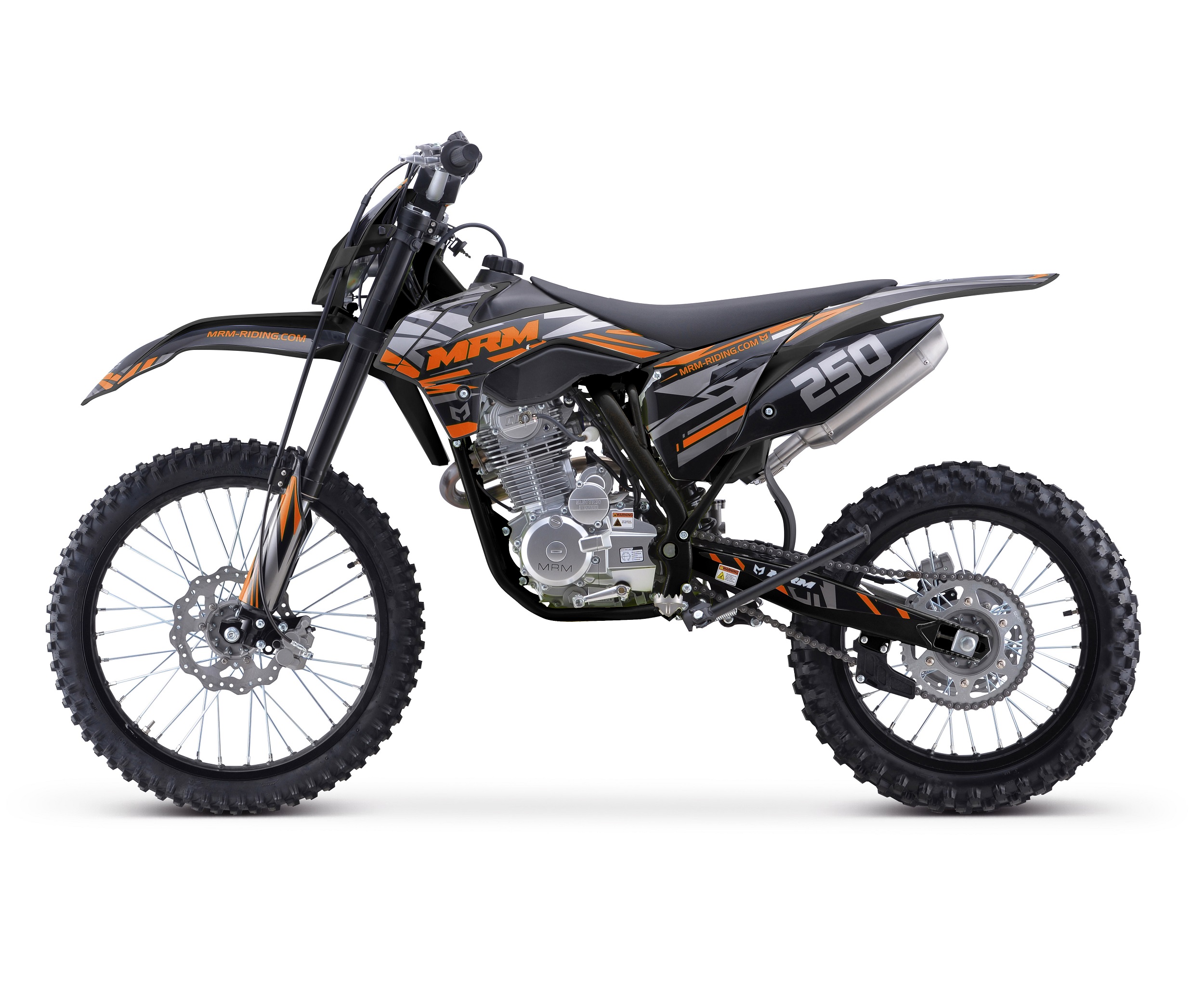 Motorka plnohodnotné velikosti na kolech 21“ vpředu a 18“ vzadu. Dostatečný výkon je zaručen motorem o obsahu 250ccm s pěti stupňovou převodovkou. Motorka je vybavena přední a zadní hydraulickou brzdou, tlumiči s nastavitelnou tuhostí (záruka komfortní jízdy i v těžkém terénu), masivním ocelovým rámem a laděným výfukem, který je zárukou skvostného zvuku.