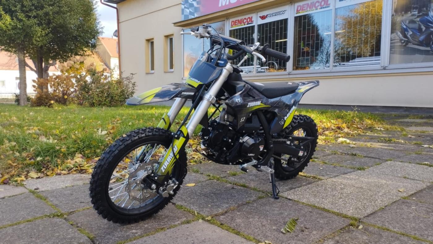 Pitbike s klasickým lěžatým motorem 125ccm je vybaven 14" pneumatikou vpředu a 12" pneumatikou vzadu, manuální převodovkou a elektrickým startérem, včetně klasické nakopávačky! Kvalitní Upside-down vidlice, nastavitelný zadní tlumič a inovovaná výfuková koncovka.