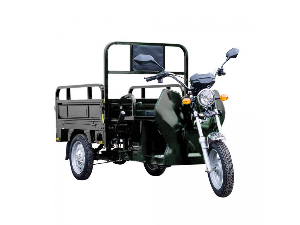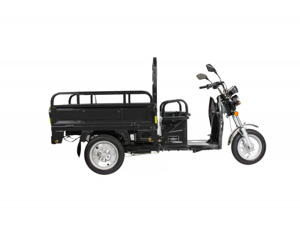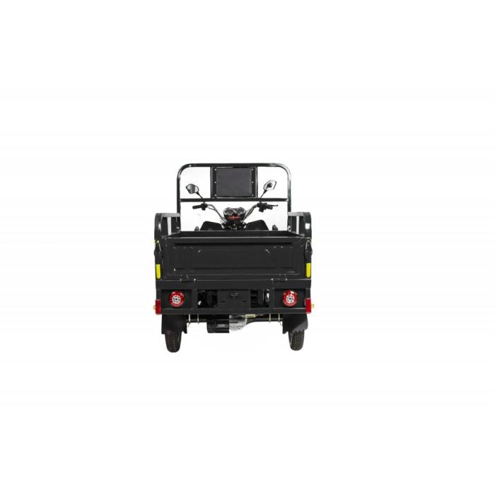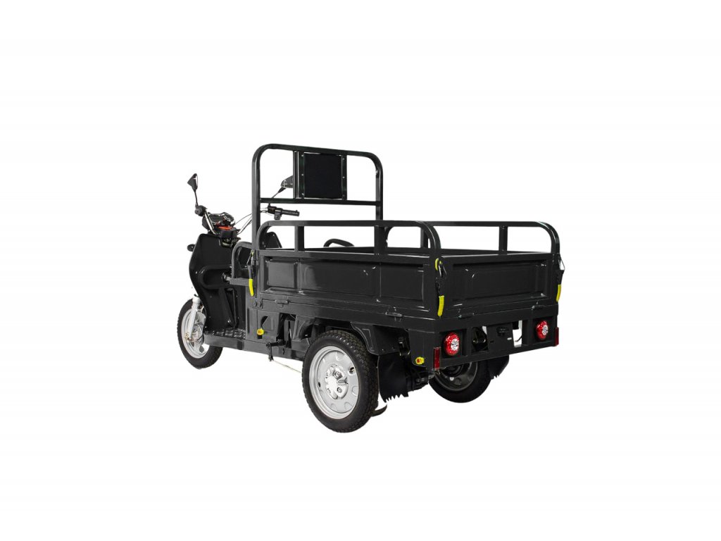Nákladní elektrická tříkolka Advento v černé barvě včetně nabíječky a redukce rychlosti připravená k okamžitému užívání. Dojezd ca 40-50 km na jedno nabití s možností přikoupení baterie a prodloužení dojezdu nebo terénních pneumatik.
