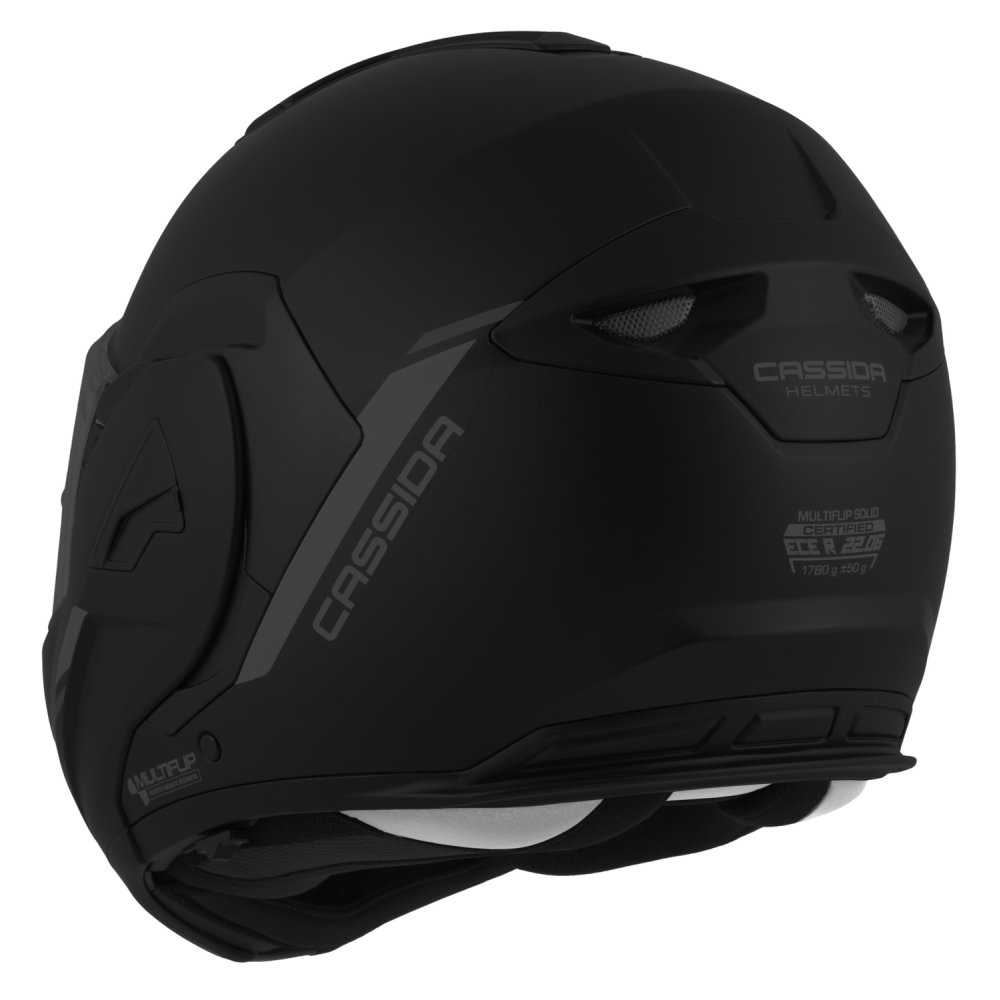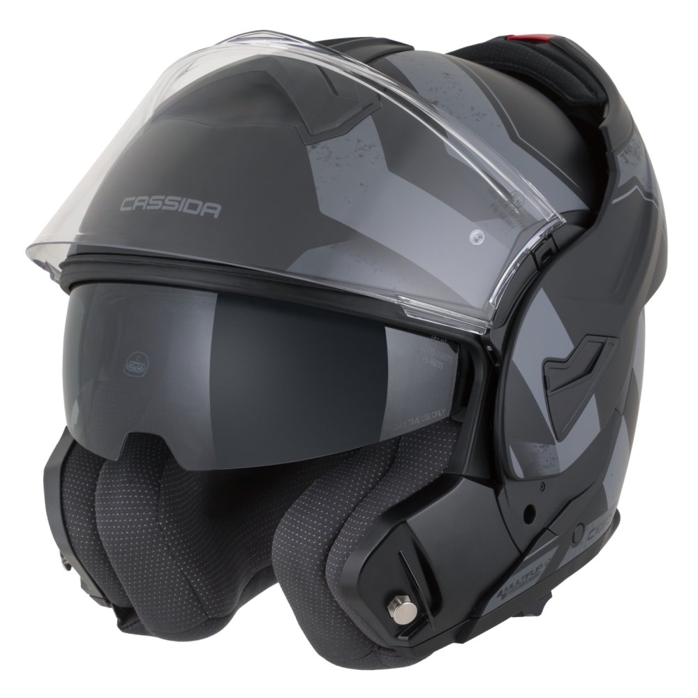 - Dvojí homologace ECE 22.06.P/J pro otevřenou a integrální přilbu s možností fixace výklopné části ve vyklopené poloze pomocí pojistky.