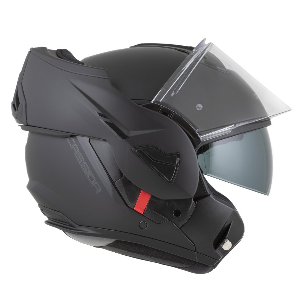 - Dvojí homologace ECE 22.06.P/J pro otevřenou a integrální přilbu s možností fixace výklopné části ve vyklopené poloze pomocí pojistky.