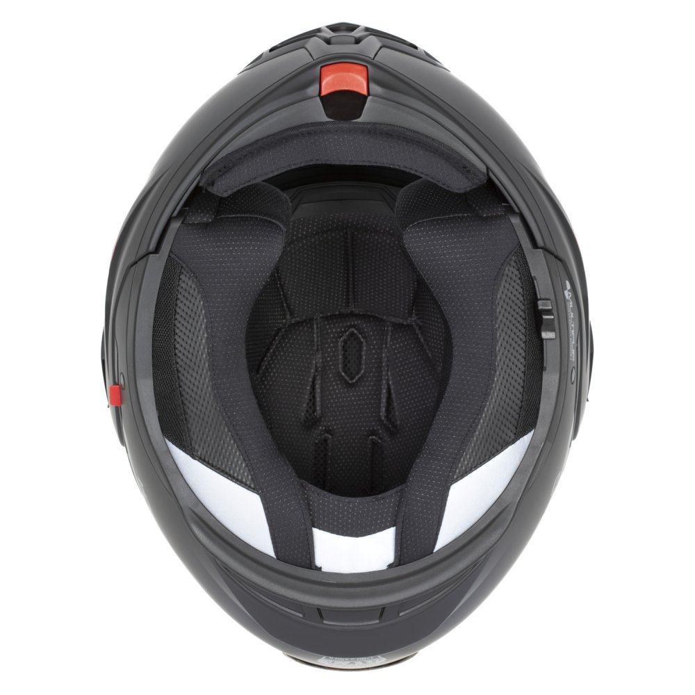 Patentovaný mechanismus překlopné části, příprava pro sluchátka s kabeláží komunikátorů a komfortní interiér z materiálu IONIC+® s částečným límcem obepínajícím hlavu ve spodních partiích, který disponuje velkým množstvím reflexních prvků.