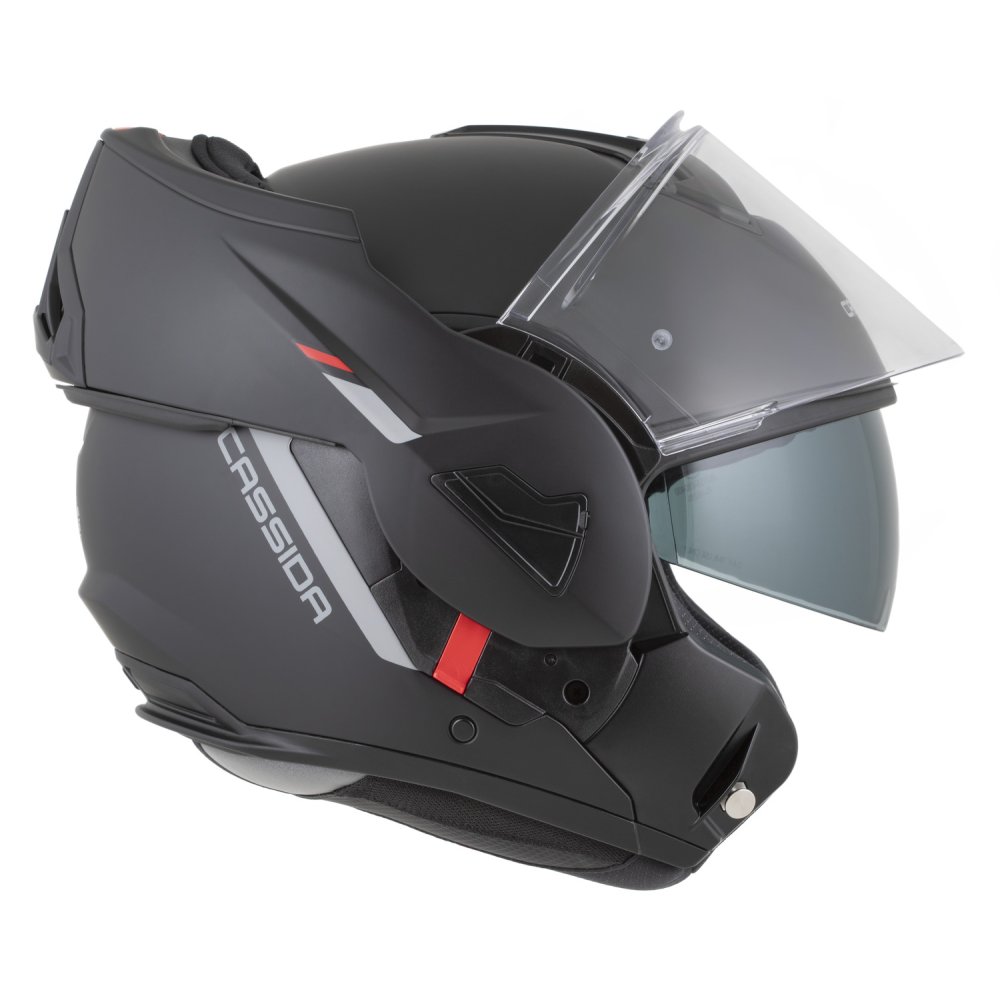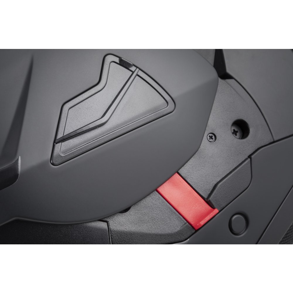 - Dvojí homologace ECE 22.06.P/J pro otevřenou a integrální přilbu s možností fixace výklopné části ve vyklopené poloze pomocí pojistky.