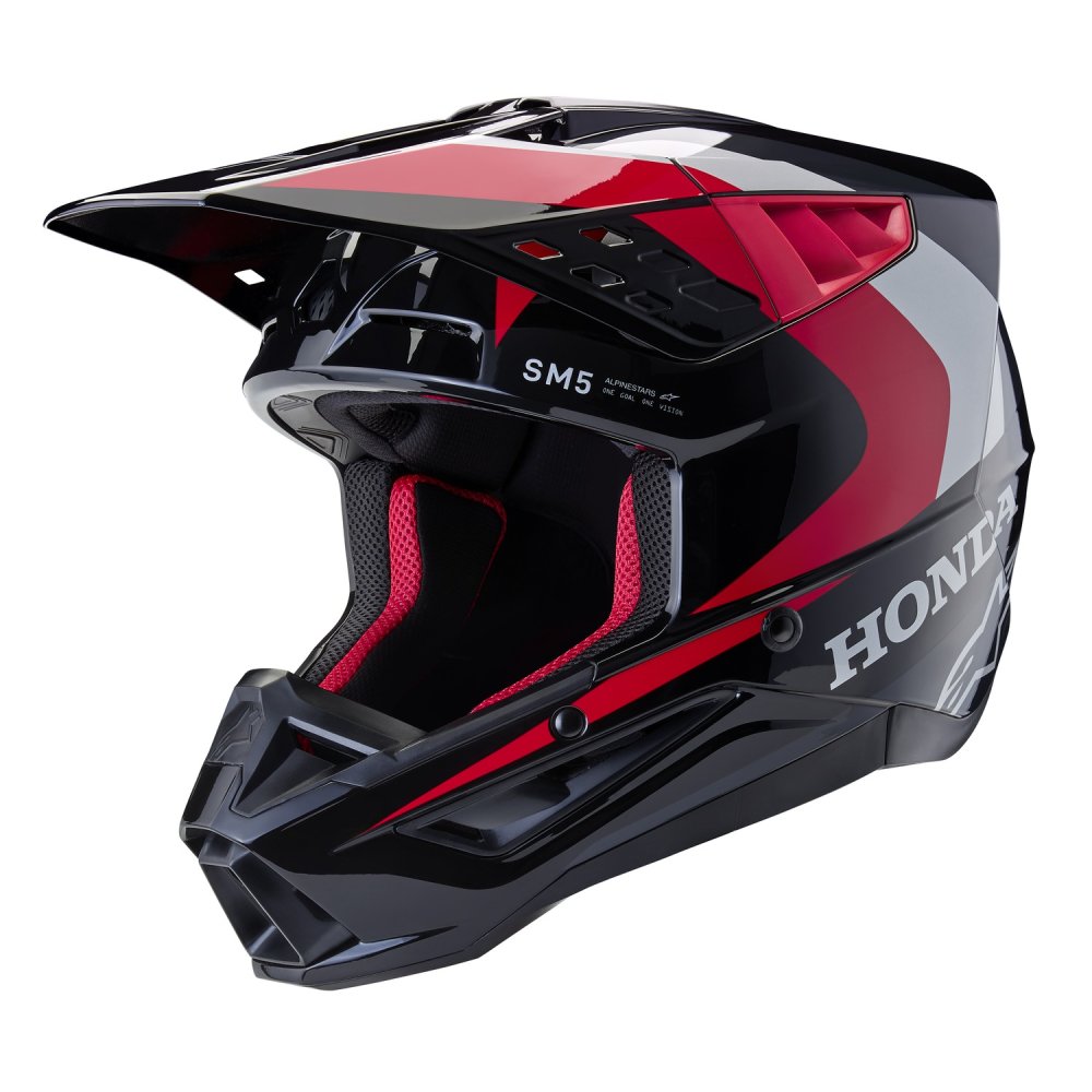 Model přilby S-M5 je výsledkem více než 5-ti let intenzivního zkoumání, vývoje a testování. Výsledkem je přilba, která poskytuje optimální kombinaci ochrany a komfortu. Lehká skořepina představuje vstřikovaný termoplast ze speciální směsi polymeru, která je vstřikovaná v různých tloušťkách na potřebných místech. Díky tomu je dosaženo skvělé ochrany proti rázovým silám na potřebných plochách s dobrým poměrem hmotnosti přilby. Vícepanelové jádro přilby s EPS panely o pěti různých hustotách zajišťuje správnou hustotu EPS v konkrétní části přilby. Mezi další důležité přednosti patří konstrukce polstrování ve spodních/bočních partiích přilby v oblasti límce, které zajišťuje efektivní roznesení sil přenášených na horní oblast klíční kosti. Přilba obsahuje kšilt s patentovaným mechanismem rychloodepínání kšiltu v případě pádu, stejně jako u vyšších modelů z nabídky terénních přileb ALPINESTARS. Kolekce ve spolupráci se značkou HONDA.