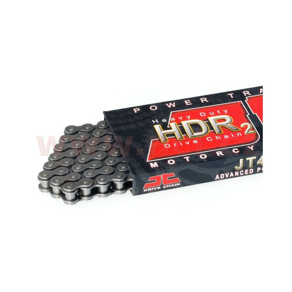 Délka čepu: 15,05 mm Tloušťka plátku vnitřní: 1,6 mm Tloušťka plátku vnější: 1,6 mm Maximální pevnost v tahu: 19,6 kN Hmotnost 100 článků: 0,74 kg Spojovací článek: sponka Typ těsnícího kroužku: bezkroužek Max. kubatura road/off road: 150 ccm Popis: HDR (Heavy Duty Chain) je primárně motokrosový bezkroužkový řetěz vhodný i pro silniční a adventure motocykly malých kubatur