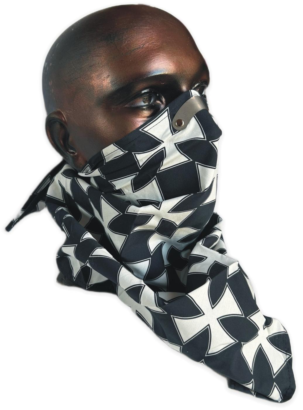 Velký trojúhelníkový šátek s kovovým skřipcem na nos a s jedinečným motivem. Díky kovovému skřipci, který lze vytvarovat podle tvaru nosu, šátek drží na obličeji i při vyšších rychlostech. Díky materiálu a technologii tisku je prodyšný, ale přitom chrání obličej před větrem, hmyzem ap. Šátek na obličej/hlavu upevňujeme zavázáním cípů šátku. Vhodný doplněk k otevřeným helmám.