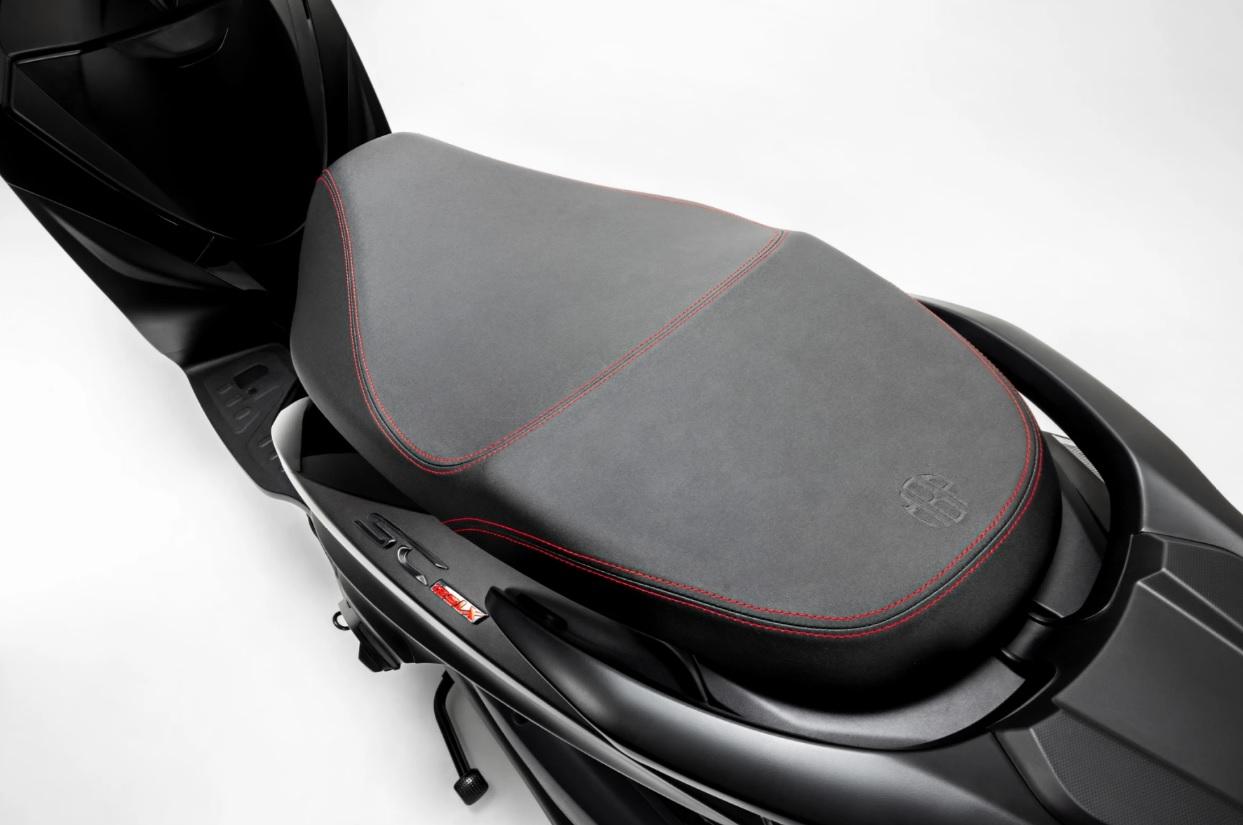 Vypovídá o průsečíku, kde se luxus setkává s funkčností. Sedadlo skútru s měkkou protiskluzovou tkaninou a výrazným červeným prošíváním vybízí k jízdě, která neubírá na pohodlí ani sportovní eleganci. Každý detail, od na dotek příjemného půvabu materiálů až po elegantnost designových linií, je vytvořen pro náročné jezdce, kteří si cení estetiky i výkonu. Zde se radost z jízdy na skútru stává synonymem umění dobře žít.