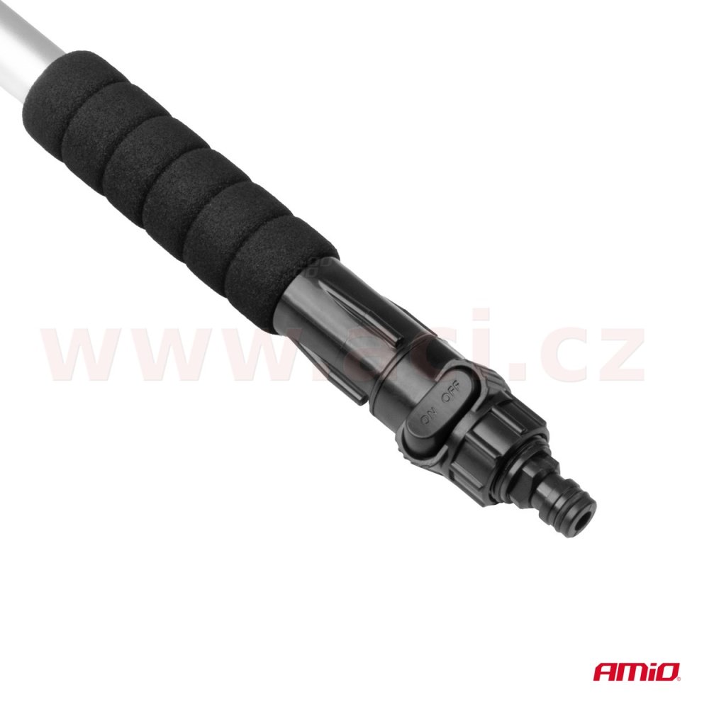 Kartáč je velmi praktický nejen pro mytí vozidel, ale také pro použití v domácnosti – zejména na vysokých a obtížně dostupných místech. Rukojeť je opatřena pěnovými úchyty pro pohodlný a bezpečný úchop, rychlospojkou pro připojení zahradní hadice a průtokovým ventilem vody.