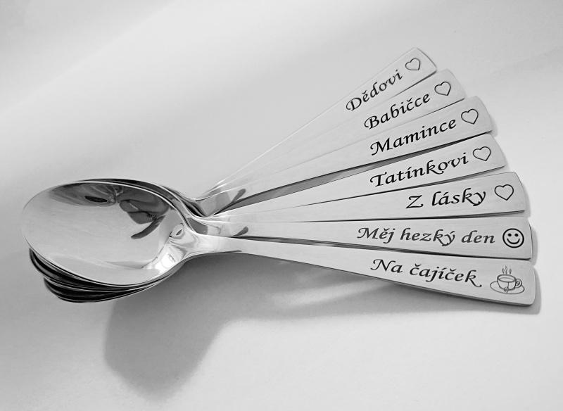 - kávová/čajová lžička s textem z nerezu s gravírováním vybraných textů